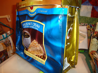I threw away the rest of the coffee bags I had. And I got a brand new trash container..... Obviously, the tote bag idea flew out the window after the Gatling gun sounds. It's not even finished....it'll stay that way!